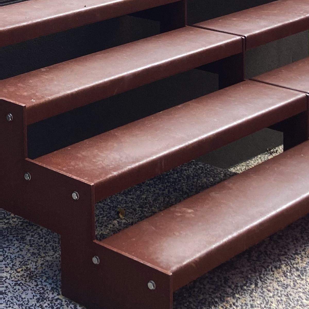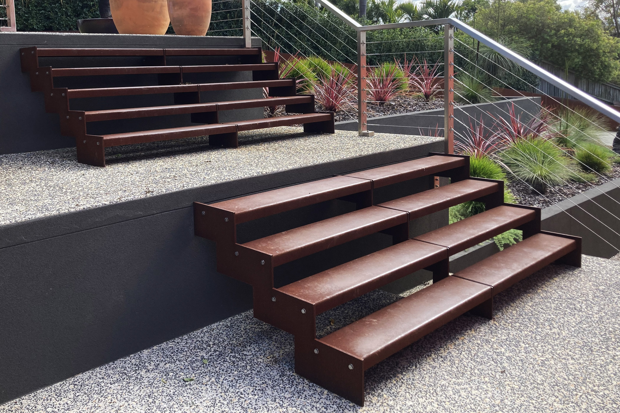 A bespoke set of steel stairs, boasting a sleek aesthetic allure perfect for the luxurious high-end residence they sit in front of. Hand crafted with meticulous precision, these stairs seamlessly blend form and function.