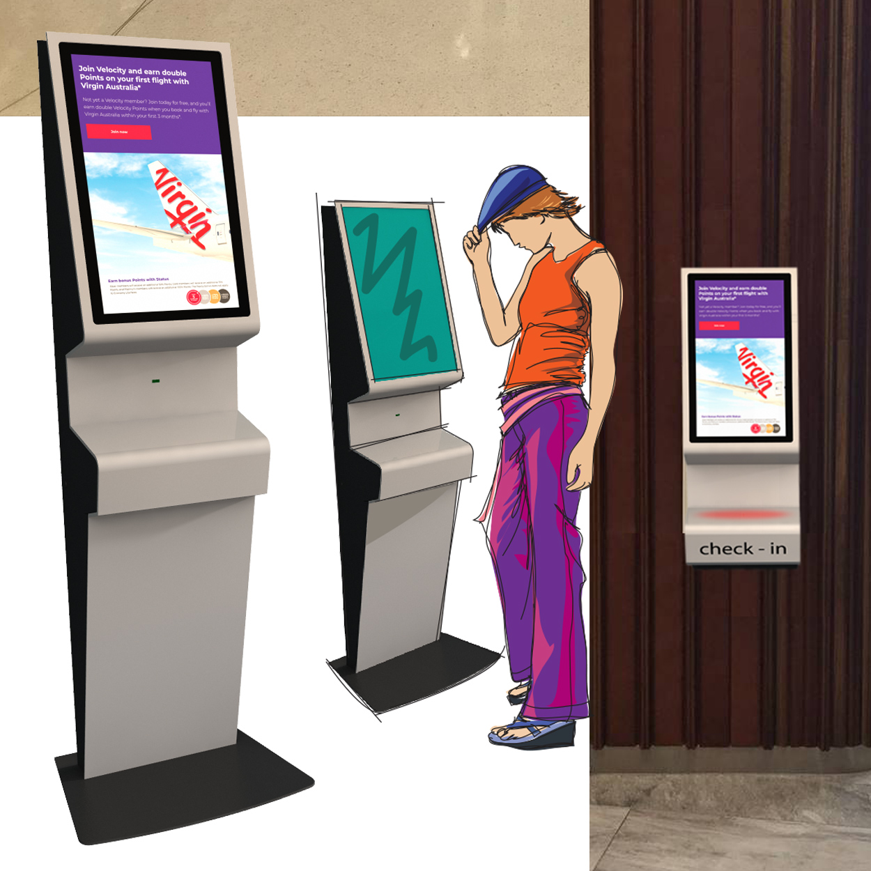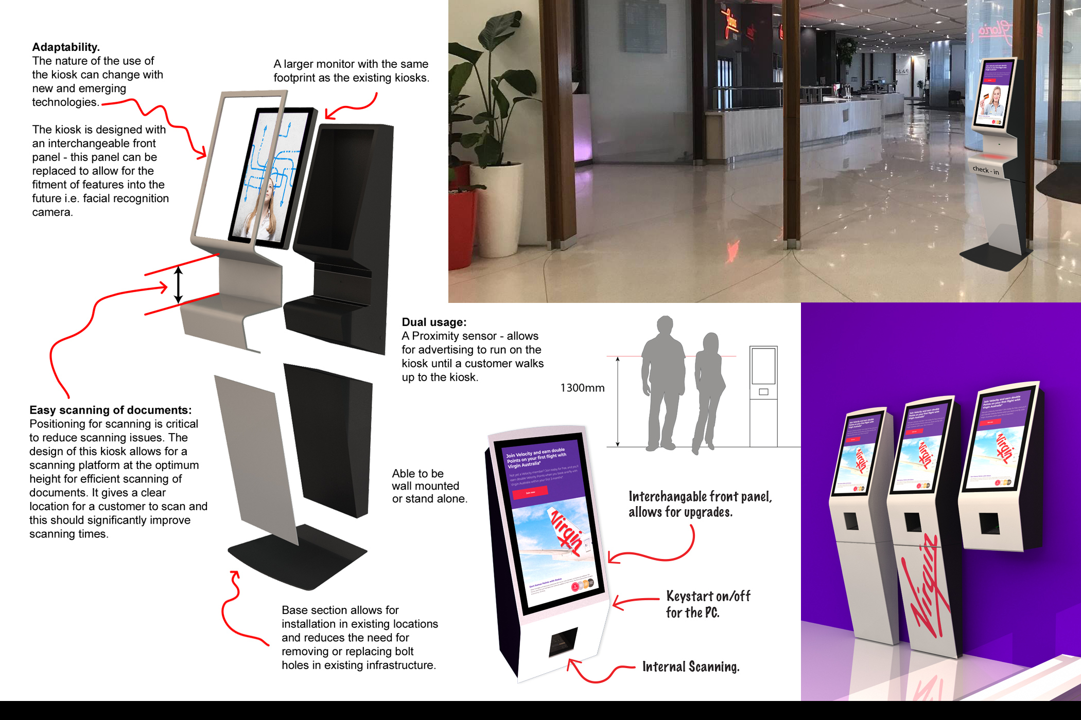 The concept design is for a self-serve solution kiosk that embraces a modern aesthetic, seamlessly integrating functionality with sleek visuals. The kiosk is designed to be used within airport lounges for quick check-ins by incorporating a sophisticated scanning system.