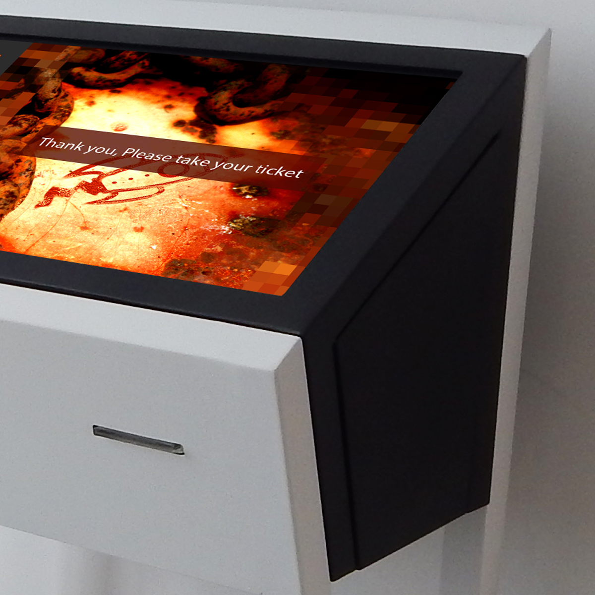 A sleek and modern designed self serve kiosk that combines metal and tempered glass, creating an aesthetically pleasing and durable exterior. The design allows for easy customisation to meet specific business needs, ensuring a perfect fit for diverse environments such as retail spaces, museums, and corporate offices.